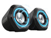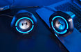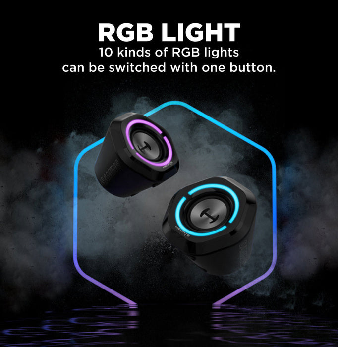 With the one-button switch of 10 patterns of RGB ambient lighting effects and the “oxeye” design, the speakers look futuristic and cool. The compact design will not overpower your gaming setup.